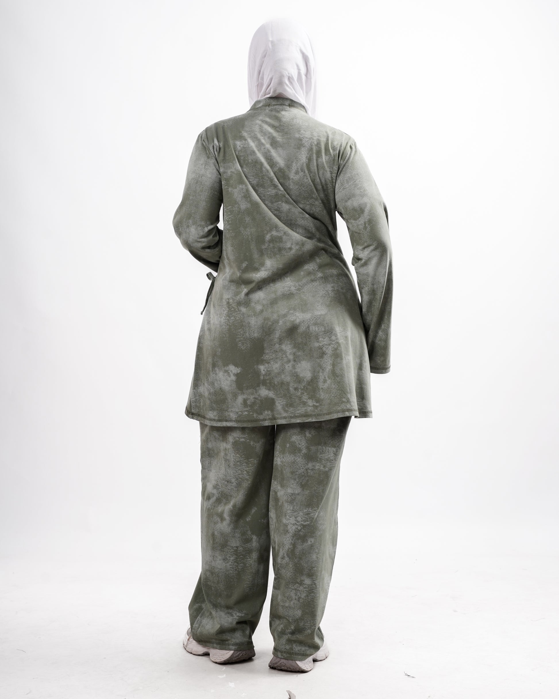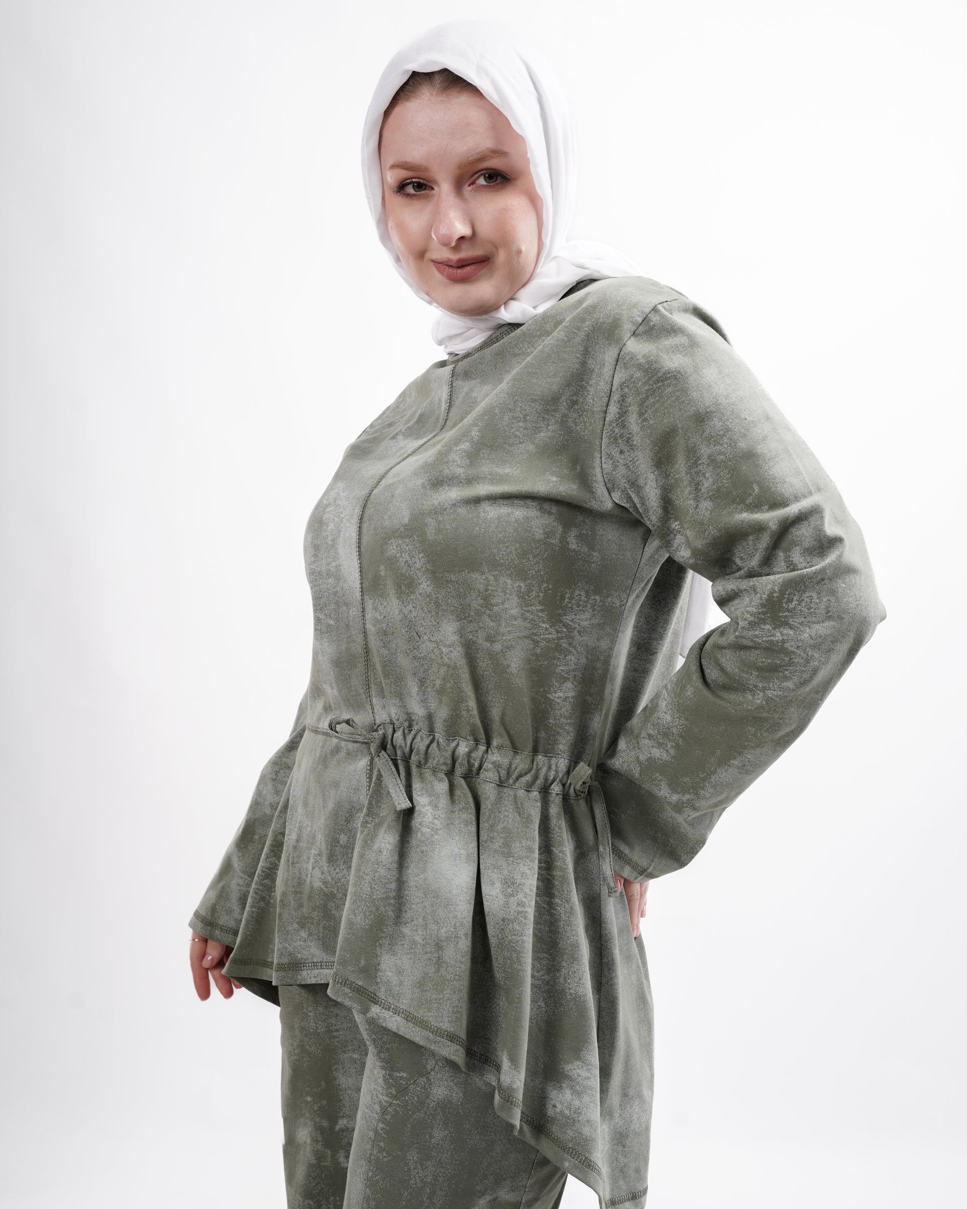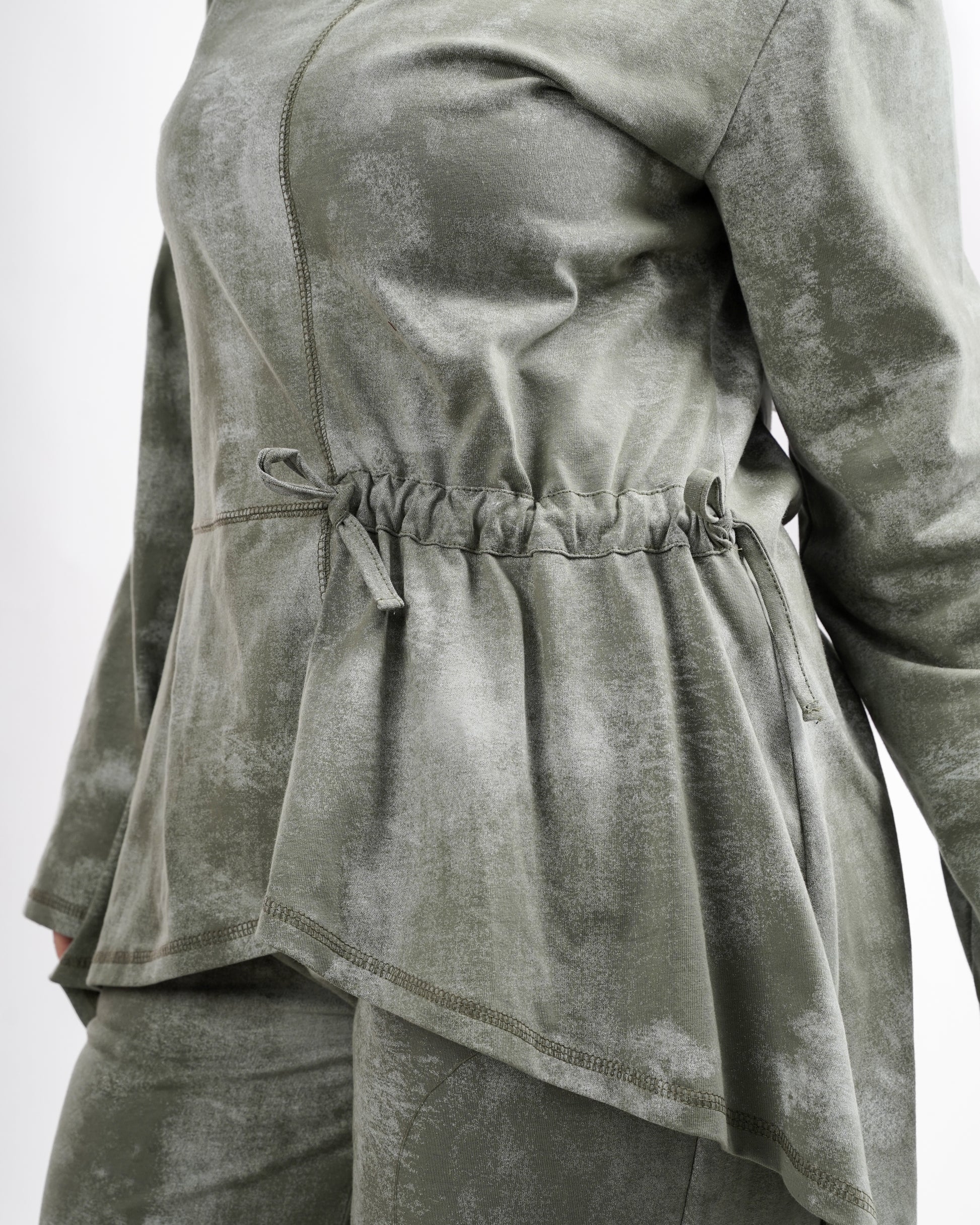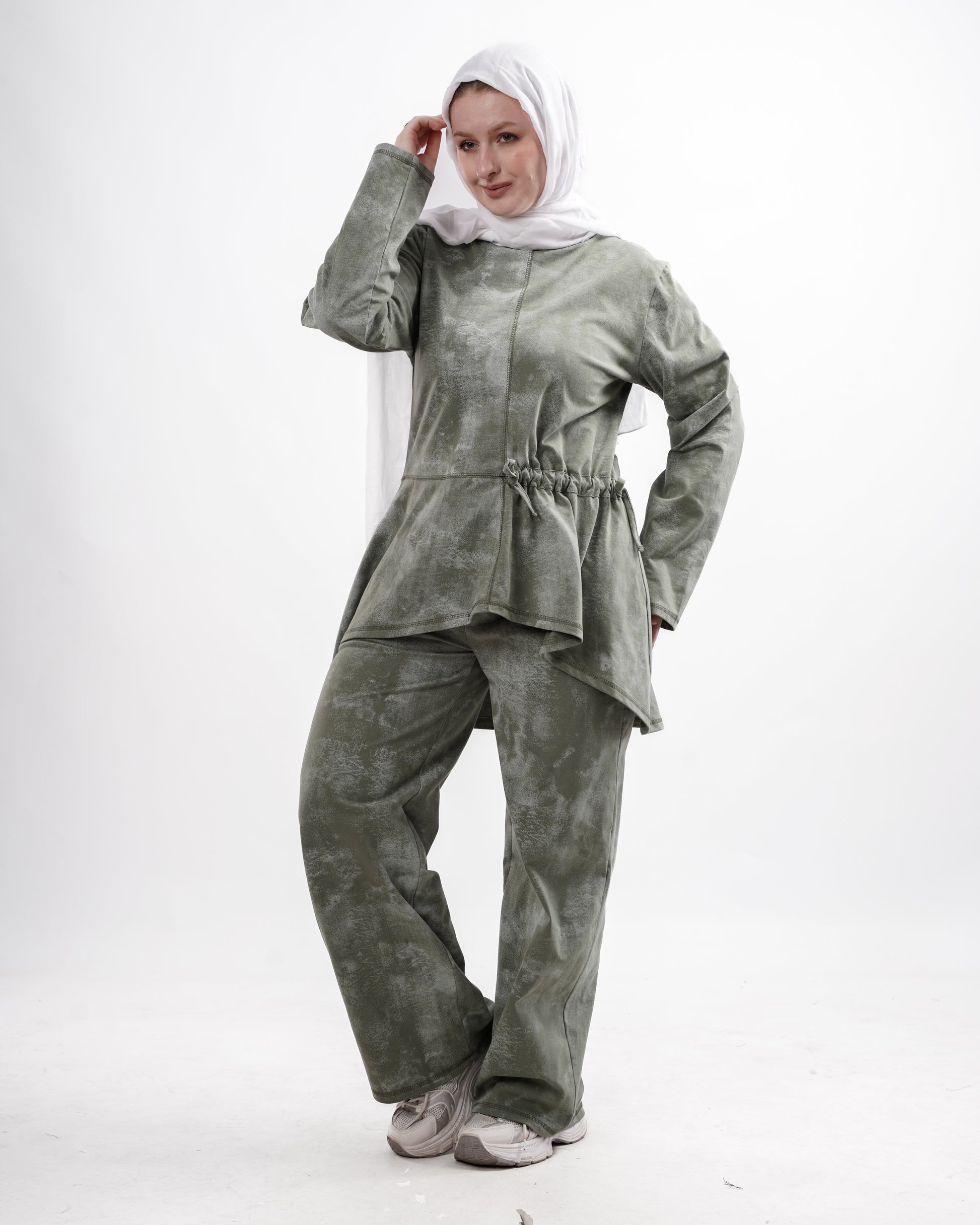 The top features a subtle asymmetrical hem with a soft adjustable drawstring at the waist, allowing you to shape the fit while maintaining a relaxed flow. Paired with comfortable wide-leg trousers, the set offers the perfect balance between casual ease and refined simplicity.