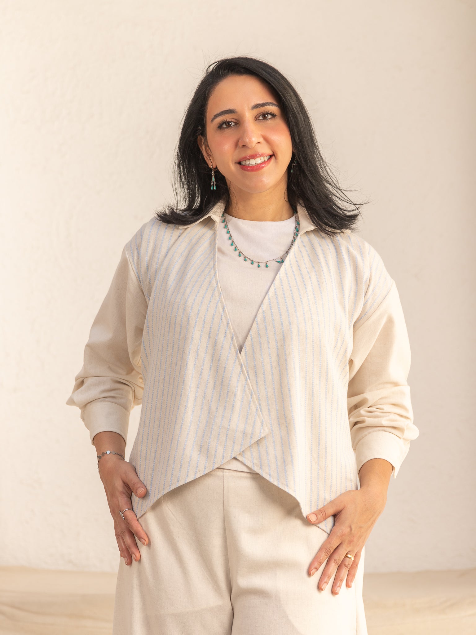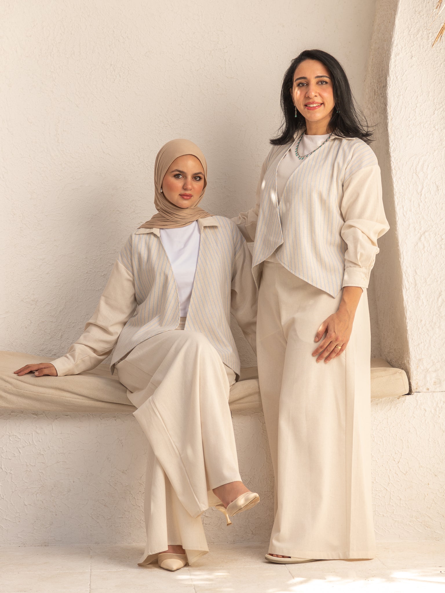 The Lyra Set is designed for effortless elegance and movement. This two-piece linen outfit features ultra-wide trousers that flow like a skirt, paired with a soft striped wrap blouse. The blouse can be tied at the back for a relaxed, airy silhouette, or tied at the front to create a more structured and polished look — perfect for a subtle shift from casual to smart.