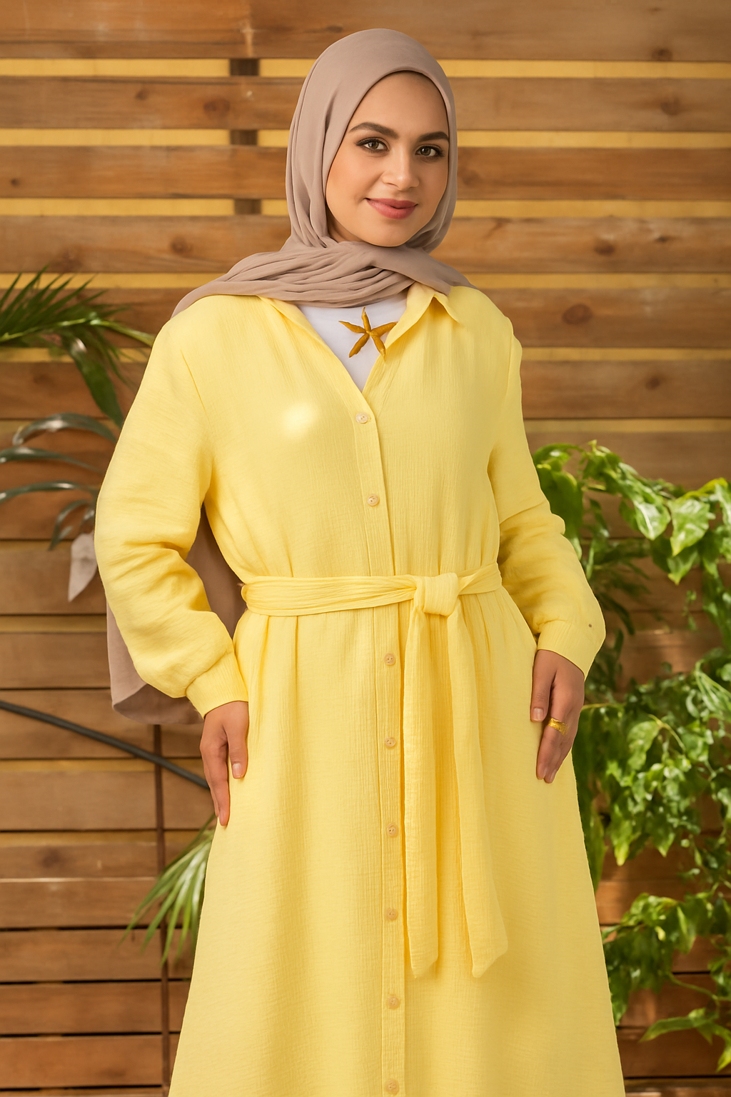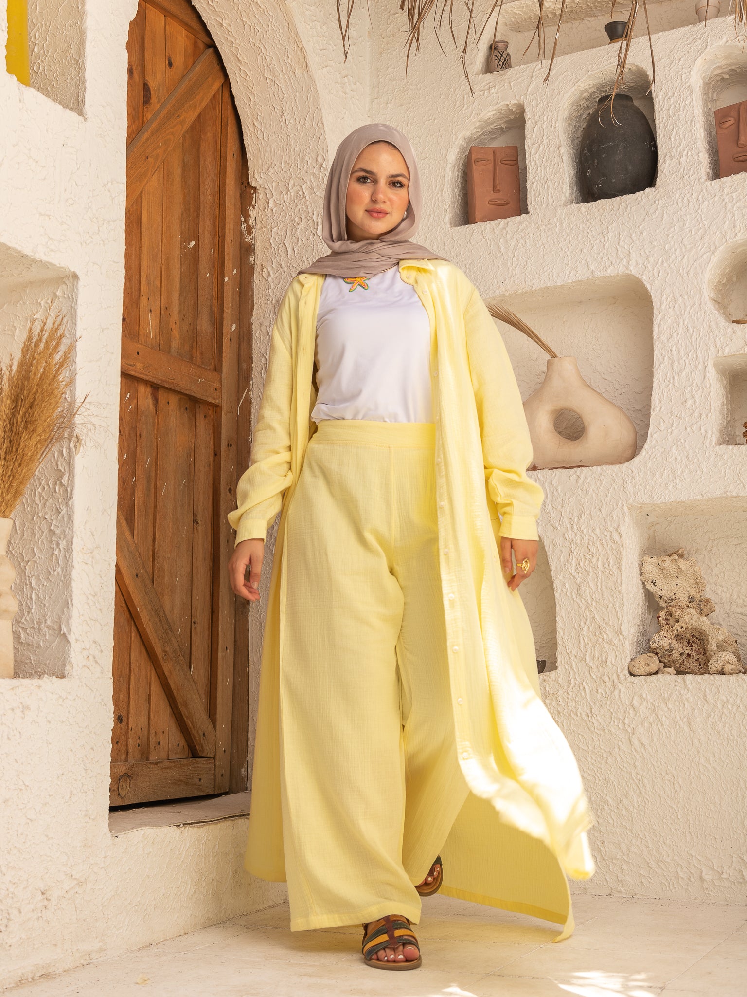Sulphur set is your sunshine statement piece — a breezy set that flows like a dress, designed with front and side buttons that allow you to wear it open or closed. Made from airy crinkled cotton for ultimate comfort, it includes a matching belt that cinches the waist for a flattering silhouette when worn as a dress.